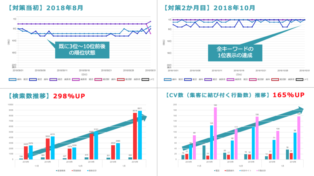 当社にご依頼頂く前は15位以下の表示となっていましたが、内部の最適化やクチコミの獲得、サイテーションビルディングを行うことにより、対策開始3ヶ月目で1位表示を達成することができました。